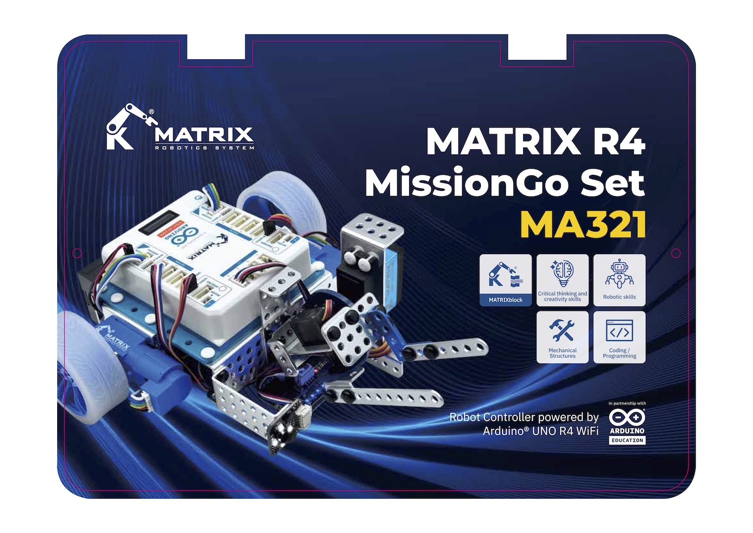 The MATRIX MissionGo Set is an educational and competitive robotics kit dedicated to WRO Robo Mission players. Powered by the Arduino UNO R4 Wi-Fi controller, this set offers enhanced connectivity and functionality, making it ideal for both competitive environments and classroom teaching.